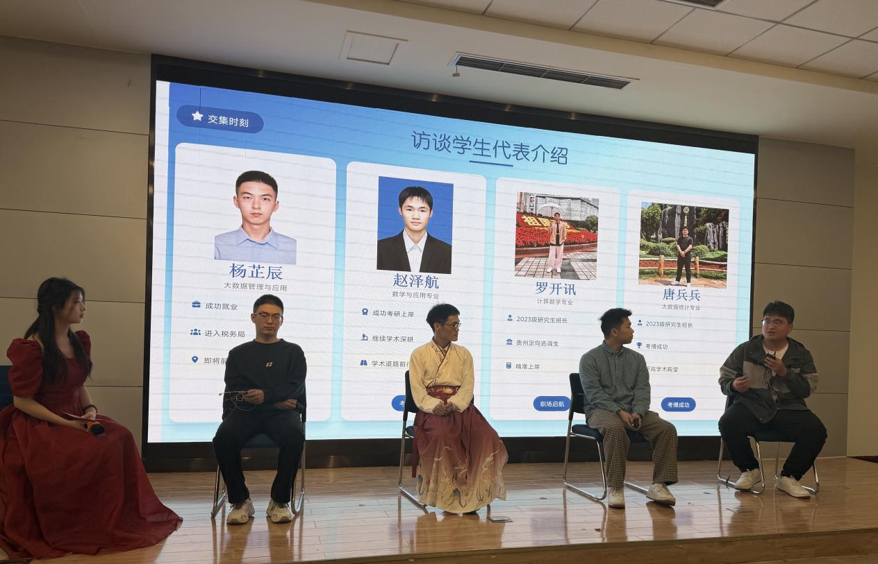 在交集时刻与访谈环节,杨芷辰、赵泽航、罗开讯、唐兵兵四位优秀毕业生代表分享求学感悟与未来规划。主持人围绕大学生活回忆、成长感悟、未来规划等话题与他们交流。有同学谈到初入校园的懵懂,也有同学分享了考研路上的坚持。随后,一首《心愿便利贴》带来轻松的旋律。